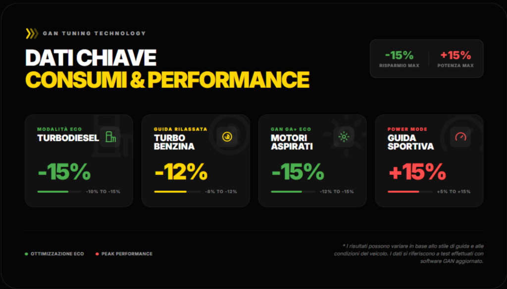Il team GAN con oltre 20 anni di esperienza conferma che la modalità Eco sfrutta mappe ECU più efficienti. Il motore lavora con rapporto stechiometrico ottimale (14,7:1 per benzina), minimizzando gli sprechi.