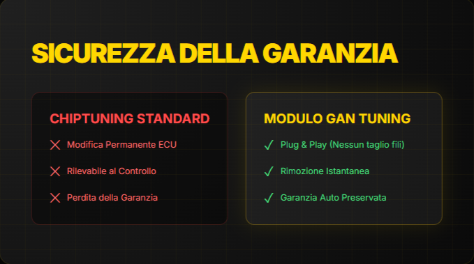 I moduli GAN preservano la garanzia costruttore perché si rimuovono in 60 secondi senza lasciare tracce elettroniche o meccaniche. Secondo i dati su oltre 30.000 veicoli dal 2015, GAN offre anche garanzia aggiuntiva motore fino €5.000 per 2 anni – copertura doppia invece che persa.