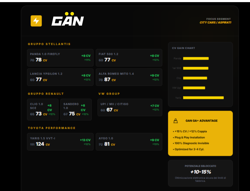 Perché è nato questo mito: Confusione con preparazioni racing che modificano hardware (alberi a camme, pistoni, compressori). GAN GA+ è solo software, parametri conservativi.