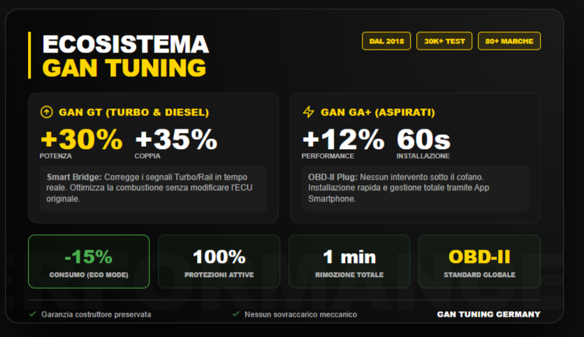 Realtà: I moduli moderni come GAN non modificano la centralina di fabbrica. Si rimuovono in 1 minuto prima di recarsi dal concessionario, senza lasciare tracce. Inoltre, GAN offre una garanzia aggiuntiva sul motore fino a €5.000.