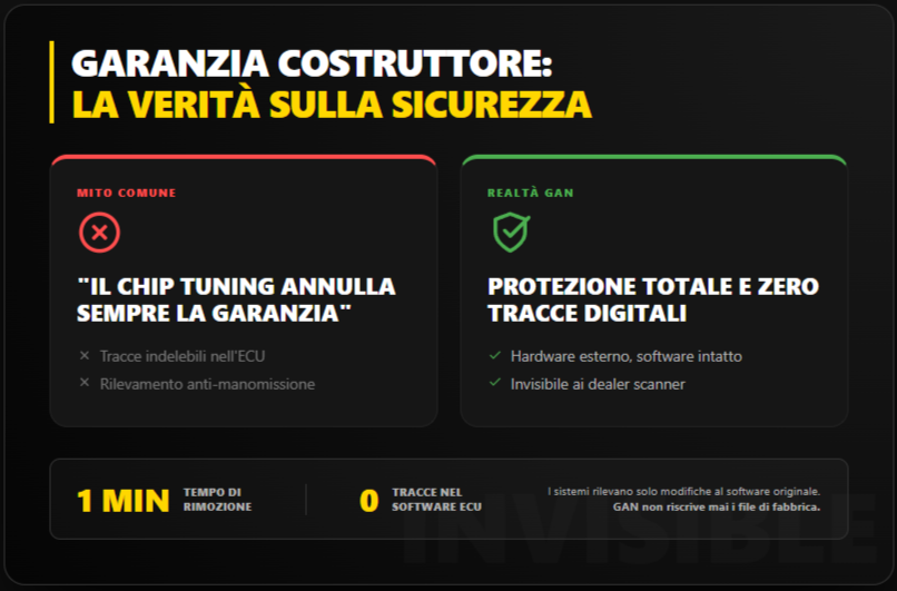 Realtà: Le centraline aggiuntive GAN si rimuovono in 1 minuto senza lasciare tracce. Durante la Revisione periodica o interventi dal concessionario, basta toglierle. I sistemi anti-manomissione rilevano solo modifiche al software ECU originale, che GAN non tocca.